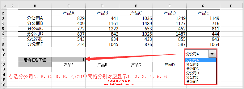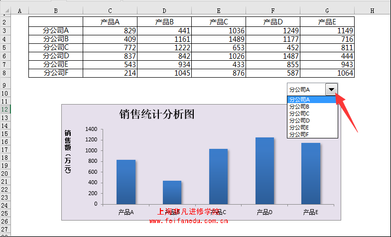 但上图只能显示分公司A的销售情况,如果分别查看每个分公司的销售情况,那只能分别制作分公司A、B、C、D、E、F,那么就有6个图表,那就更麻烦了。