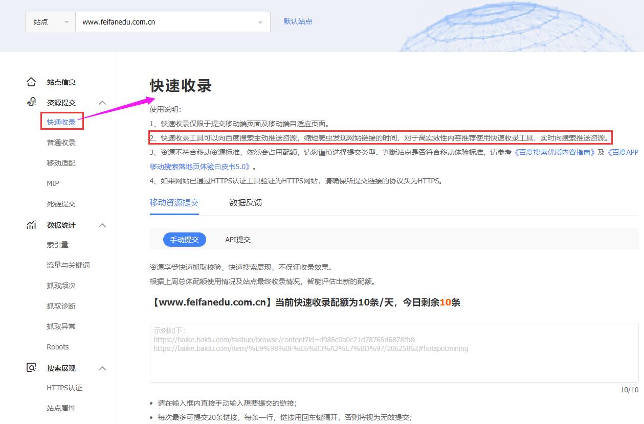 2、快速收录工具可以向百度搜索主动推送资源,缩短爬虫发现网站链接的时间,对于高实效性内容推荐使用快速收录工具,实时向搜索推送资源。