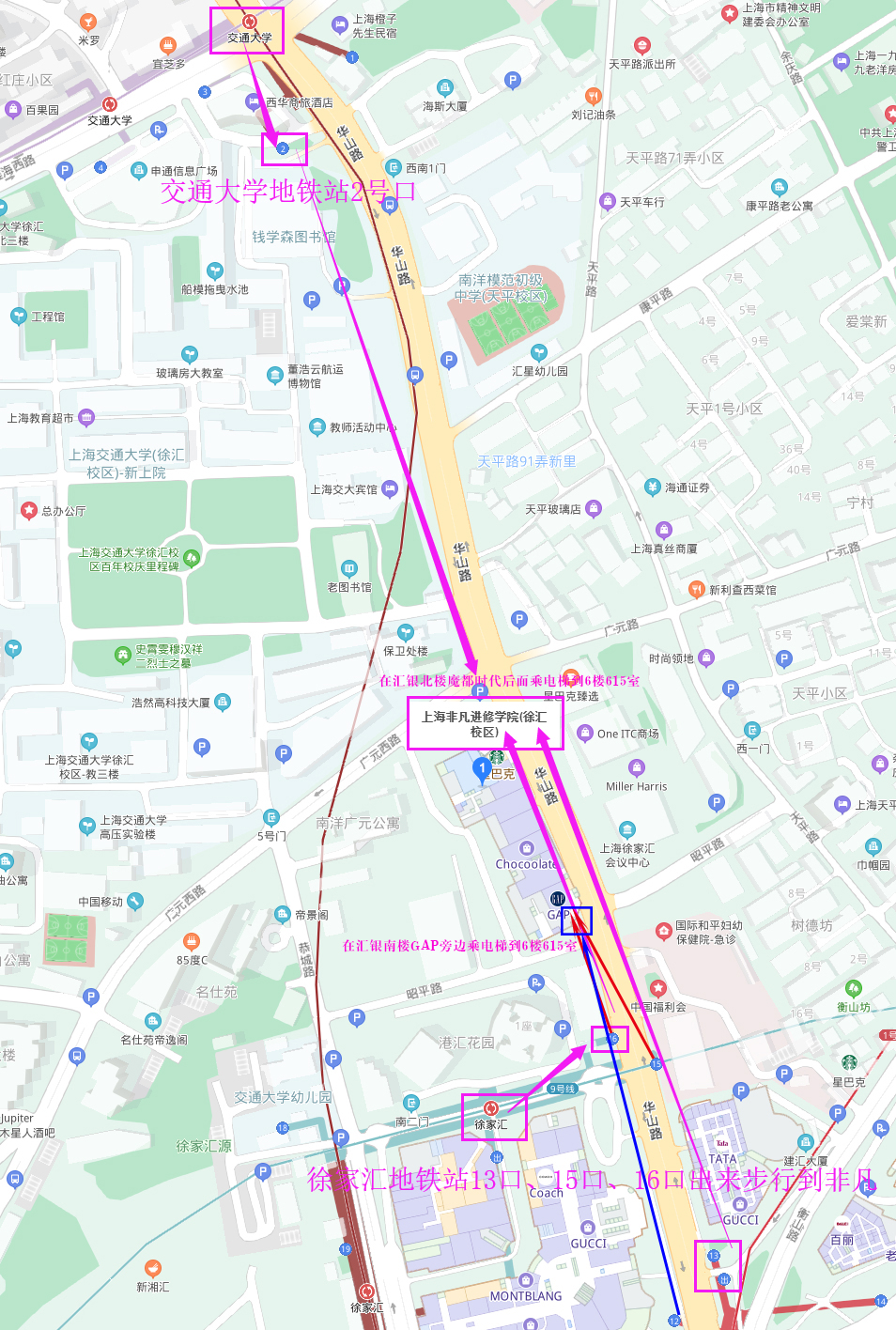 1、从1、9、11号线徐家汇地铁站的12、13、15、16口和10号线的交通大学地铁站2号口出来