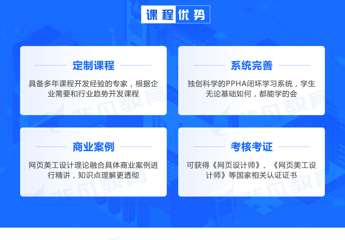 2020年:网页美工设计培训课程增加C4D美工设计培训、页面切图实战训练;非凡教育作为上海正规的网页美工设计培训机构,具有办学许可证,全程名师面授教学,PPHA教学考核体系,毕业推荐+招聘双选会。
