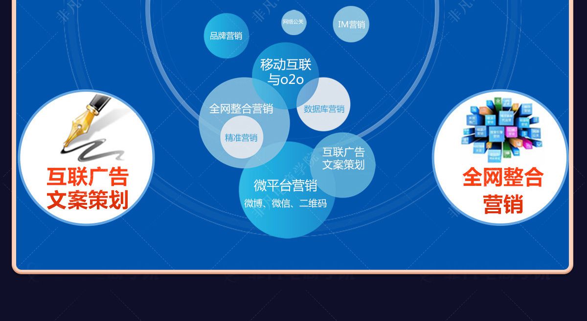 网络营销培训班是上海非凡教育学校(学院)的特色课程,还开设微营销培训,SEO优化培训,新媒体推广培训,全网营销师培训班,完善的教学已培养大批网络营销师人才,非凡教育高级电商网销培训就业班学习内容,本课程适合的学习对象:1、在企业中担任网络营销/电商/SEO优化人员,想通过网络营销培训机构学习后转型为总监或想独立运营的人员;2、对网络营销培训/SEO优化培训比较喜爱的零基础学员,对网络营销及电子商务感兴趣者优先录取。