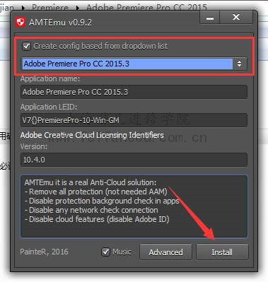 11、第一十一步:点击install。打开之后选择adobe premiere pro cc 2015,小编不小心选错了,反正只要记住选择adobe premiere pro cc 2015就可以了,点击install。 如图一十一。