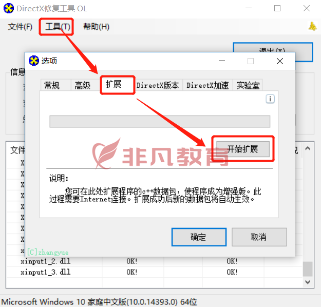 后来有教程说这个DirectX修复工具可以修复。安装最新版DirectX后扫描提示C++系统有很多错误,然后修复了大部分,仍有错误提示要升级到增强版。原来这个软件是标准版,同学们可以在菜单--工具--选项--扩展中选“开始扩展“,便可升级到增强版,就可以修复C++错误。