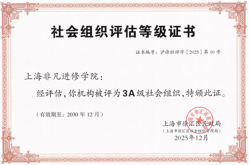 近日,上海非凡进修学院(简称 “非凡教育”)再获权威认可,凭借规范办学与诚信服务,再次获评AAA级社会组织。这不仅是对非凡20年职教深耕的肯定,也彰显了非凡教育在职业教育领域诚信办学的良好形象。