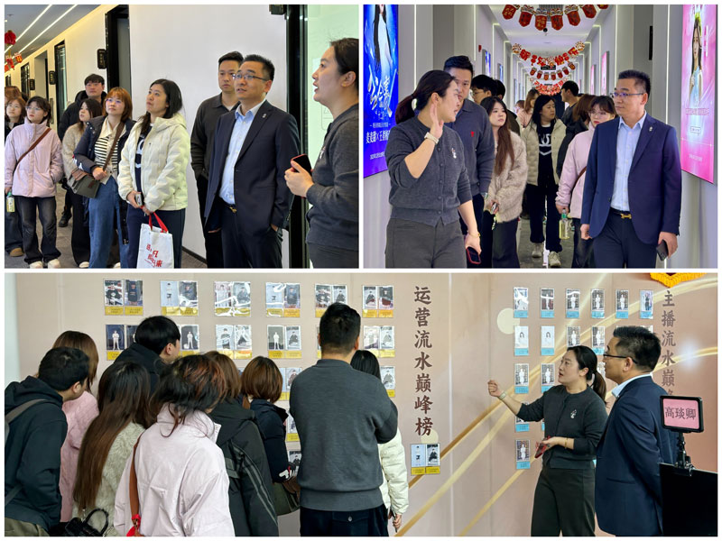 当日下午,参访团抵达新心文化上海总部。在人事总监何佩、总裁助理施沂呈的陪同下,学员们实地参观了集创意、技术与运营于一体的现代化直播基地。作为华东地区传媒行业的标杆企业,新心文化拥有上万平米的创意空间、近600间专业直播间及先进的运营设施,学员们近距离感受到了直播行业的前沿生态与蓬勃生机,对行业实际运作有了直观而深刻的认识。