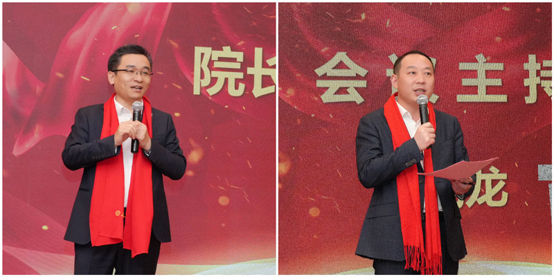 18时08分,晚宴在倒计时视频中正式启幕。主持人邀请董恩海院长上台致辞祝酒。本次祝酒环节特别采用了"数字人+真人"的创新形式,送上新春祝福,随后董院长邀请各事业部负责人及各分校长共同举杯,向全体员工及嘉宾致以最诚挚的新年祝愿,将晚宴气氛推向第一个高潮。